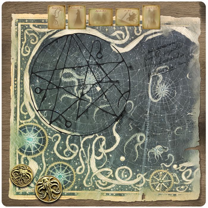 Anti-slip rubber mat dedicated to the Arkham Horror game. The mat shows a sea map drawn on papyrus. There are marked fields for the game on the mat. Such visuals allow a better feel for the game, which greatly enhances the gameplay experience. In addition to the increased aesthetic value of the game, the mat further protects the pieces from damage and shifting. Unofficial product, compatible with the game Arkham Horror.