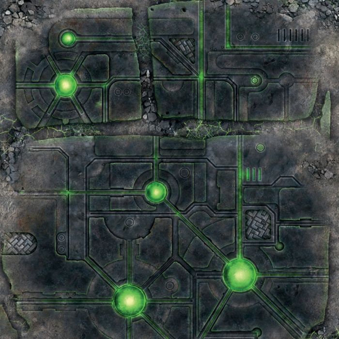 Unveil the remnants of an advanced civilization with the "DeathWorld Tomb" battle mat (48"x48" / 122x122 cm), perfect for Necromunda and Infinity. Its cool gray tones contrast with glowing green lights, creating a setting filled with technological mysteries. This mat provides the perfect battleground for epic encounters in a world where every structure holds untold power. Prepare your forces for strategic warfare in a futuristic landscape!