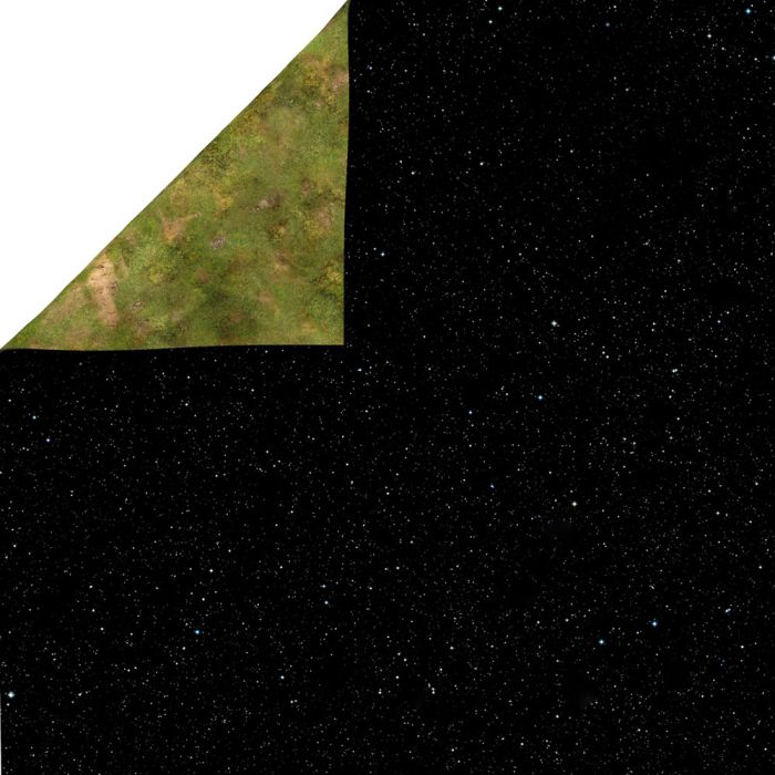 The Double-sided universe is a mat that perfectly reflects the atmosphere of distant space in battle games and RPG. A 36'x36 ' / 91.5x91.5 cm rubber mat is great for games in Battlestar Galactica, Halo: Fleet Wars and Star Trek: Attack Wing. On the other side of the mat, a grassy plain pattern is fitting to a variety of skirmishes.