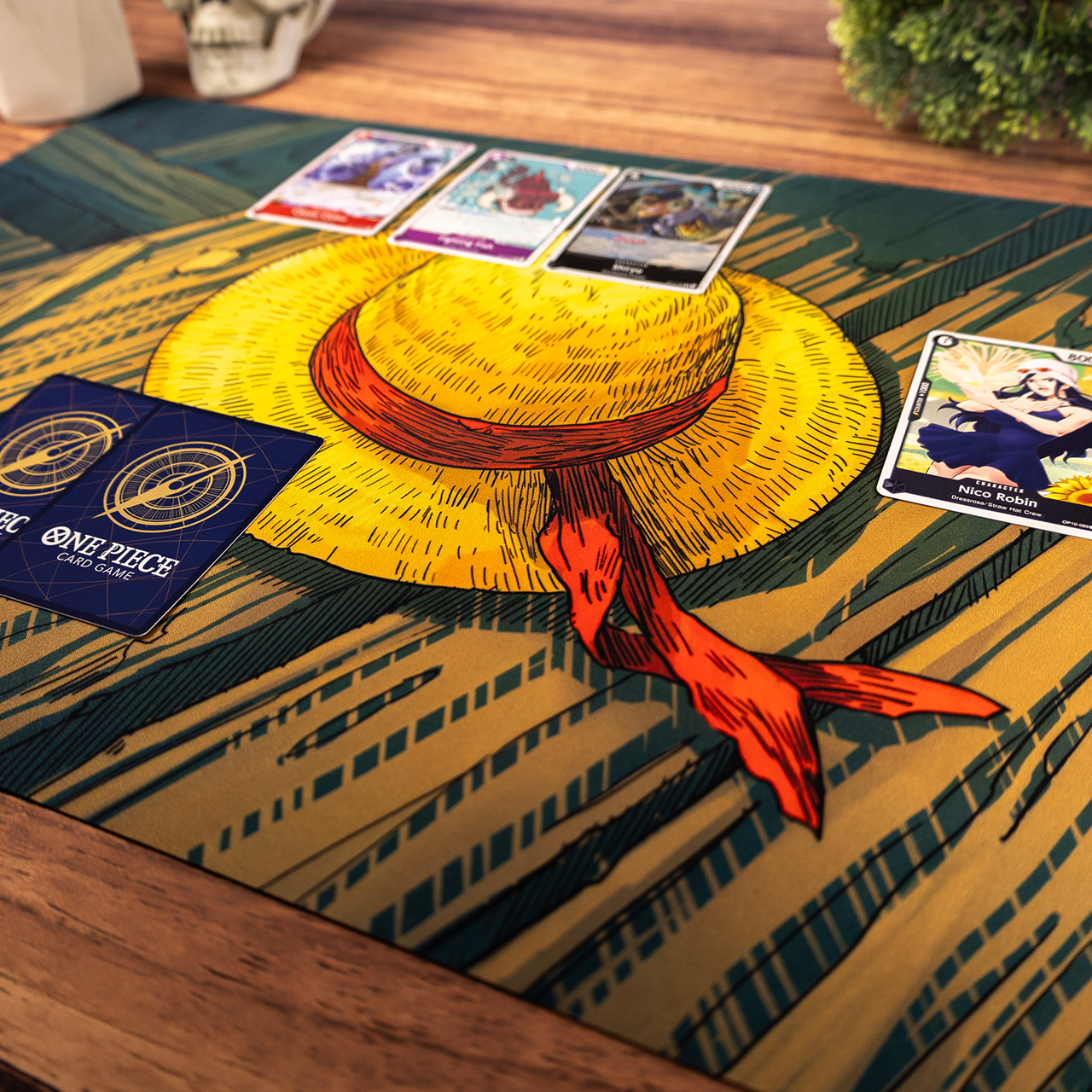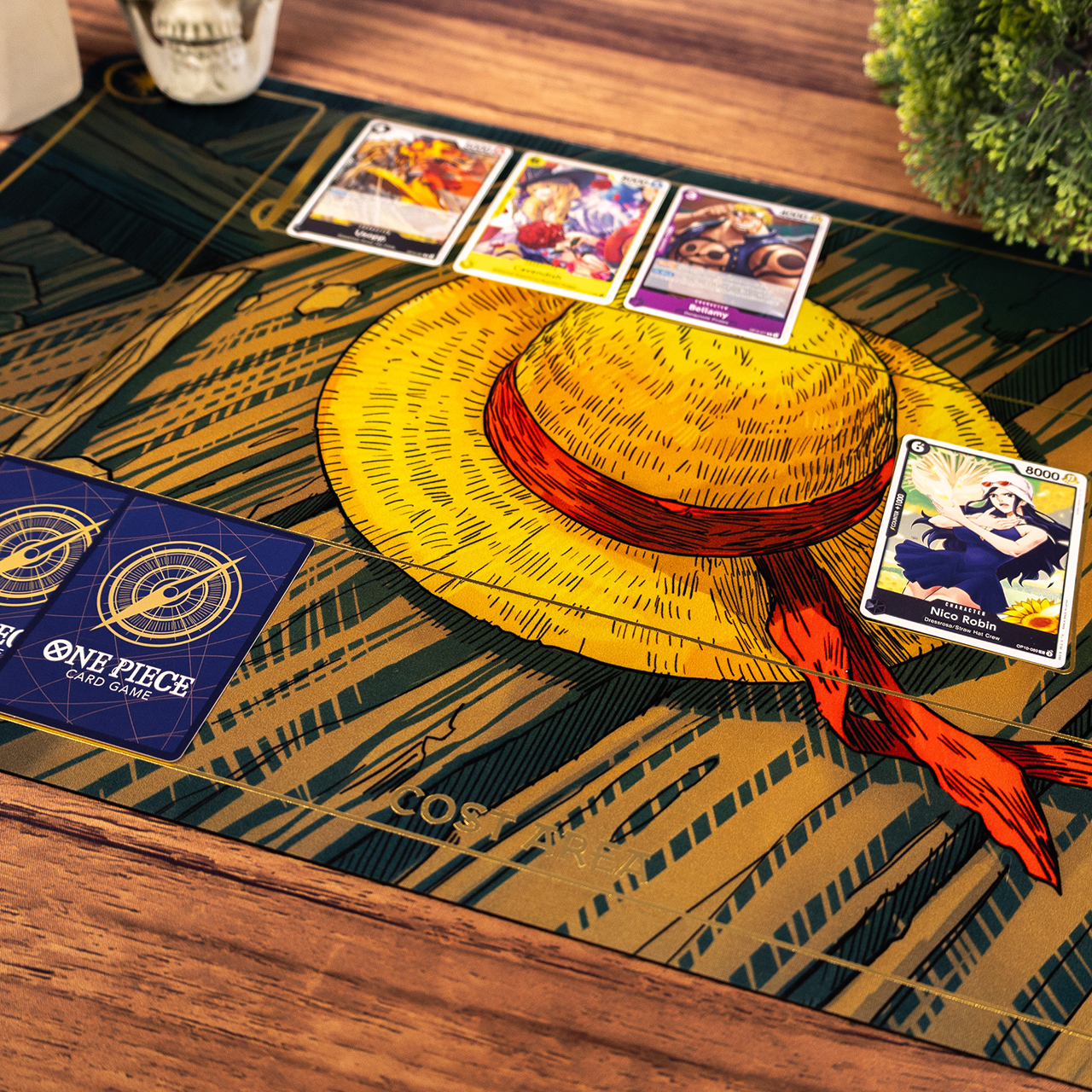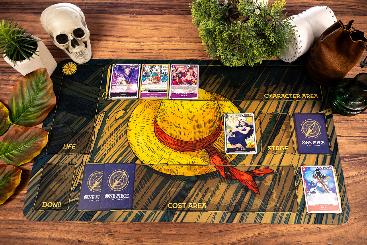 Feel the wind in your sails and the spirit of freedom. The Straw Hat mat is a tribute to the greatest adventure on the seas. We offer an artwork-only version, a printed grid version, and a premium variant with gold foil. The mat is fully compatible with the One Piece card game, featuring zones for Life, Don!!, and Leader cards. Non-slip rubber acts as your stable deck during every clash. Become the Pirate King! Let’s play together!