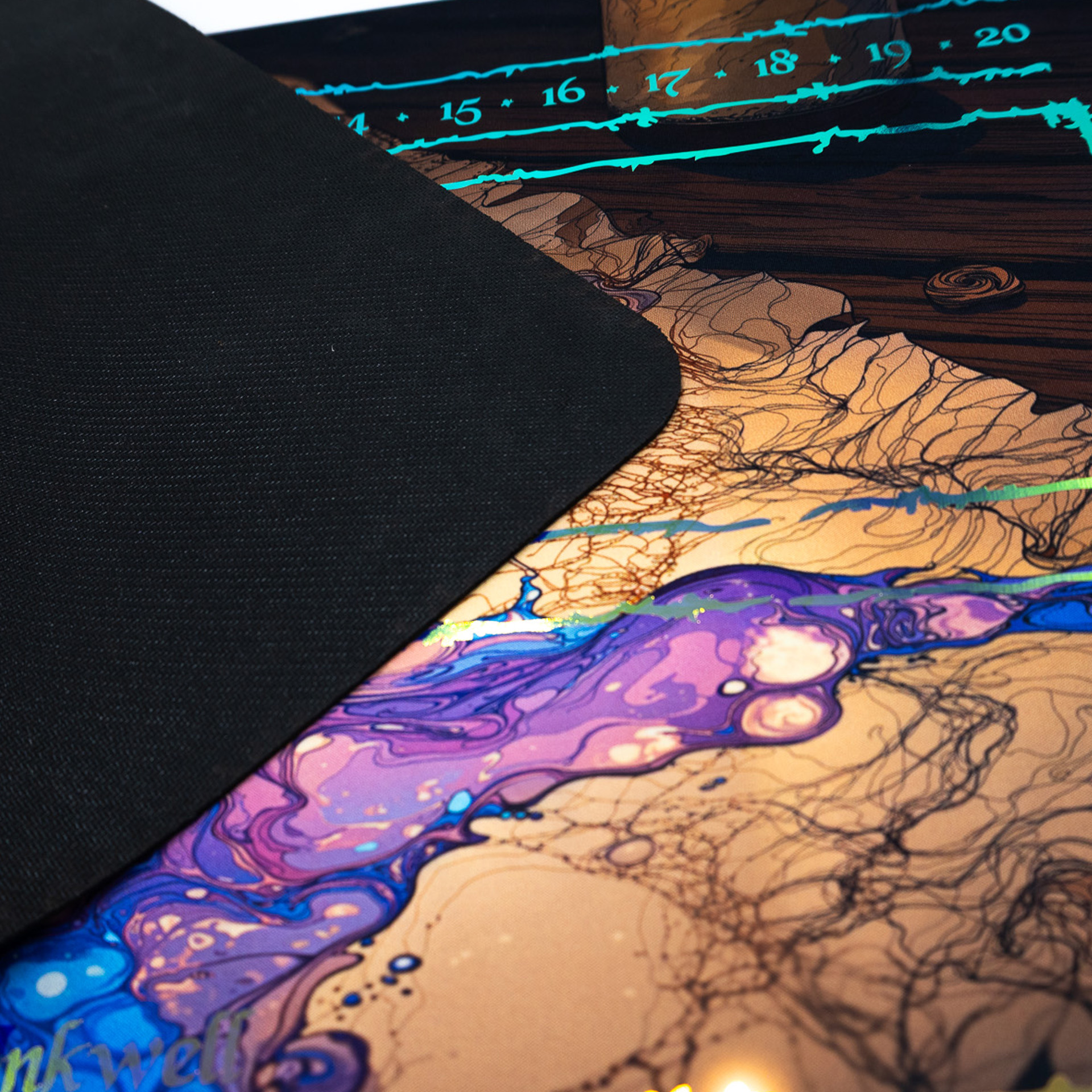 Ink flowing like a living river spreads across parchment, forming shapes that resemble forgotten maps and unwritten stories. The “Magic Quill” playmat invites you to step into that world of legends, where each card played feels like writing a new chapter of a fairytale. Created for Lorcana enthusiasts, it blends practicality with a vibrant, thematic design.