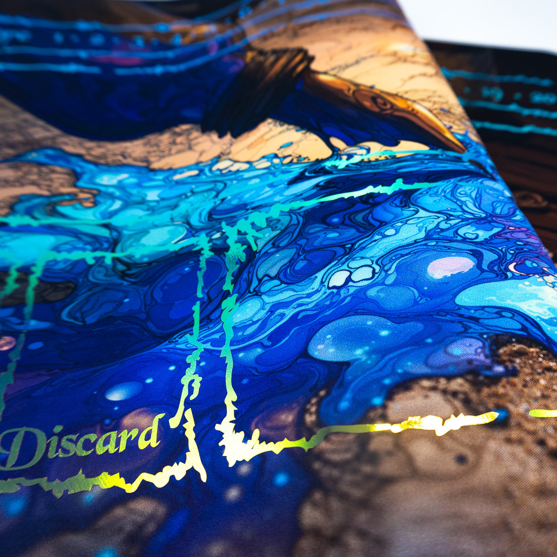 The playmat measures 61x35 cm, offering enough space for arranging cards comfortably. Its 2 mm thick rubber base holds firmly to the table surface, preventing slips and protecting your deck. The striking design of a quill pouring ink captures the imagination, turning every game session into part of a larger narrative.