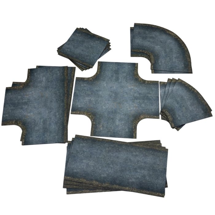 Enhance your battlefield's authenticity with the "Old Asphalt" 2D road set, designed for 28 mm scale wargames. The set includes 19 pieces, available in rubber or anti-slip material, ensuring durability and stability. Perfect for science fiction, WWII, and post-apocalyptic systems like Flames of War, Warhammer 40k, Infinity.