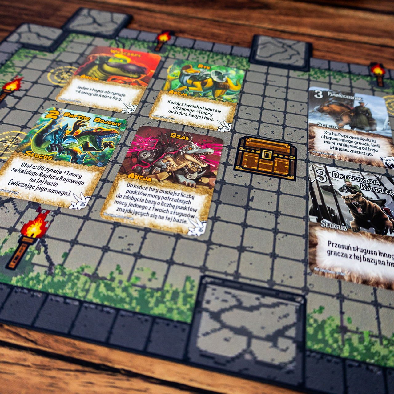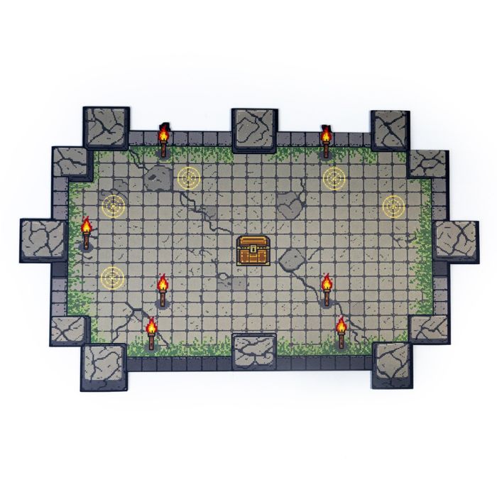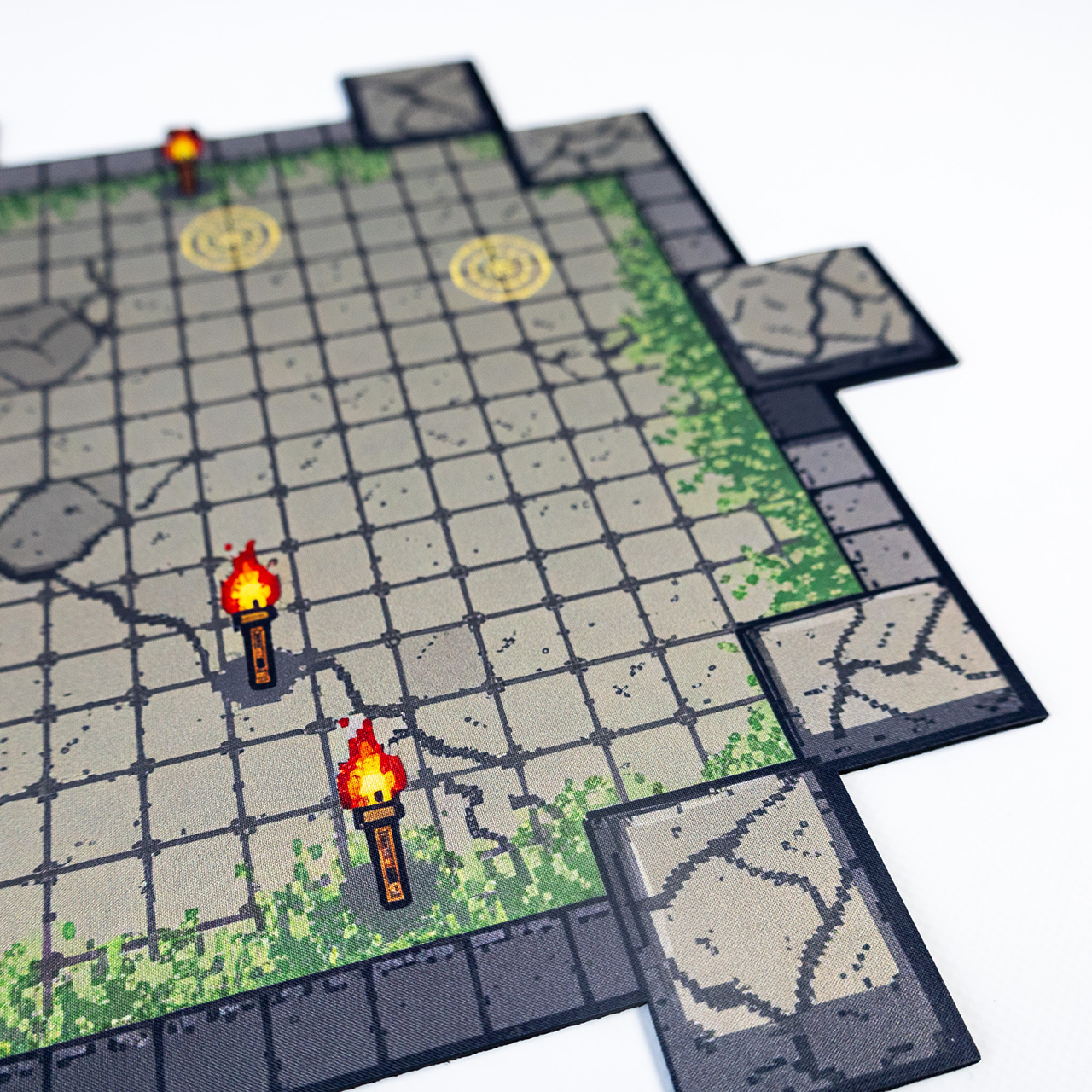 The pixel grid visible on the print can be helpful for games requiring movement on squares or arranging cards in rows which further increases the utility value of the product. The dark color scheme of the stone floor is practical because possible dirt is less visible on it and colorful card sleeves or figures contrast perfectly with the background. This is a mat that will work well both at home and on a trip because it is easy to roll up and pack into a backpack.