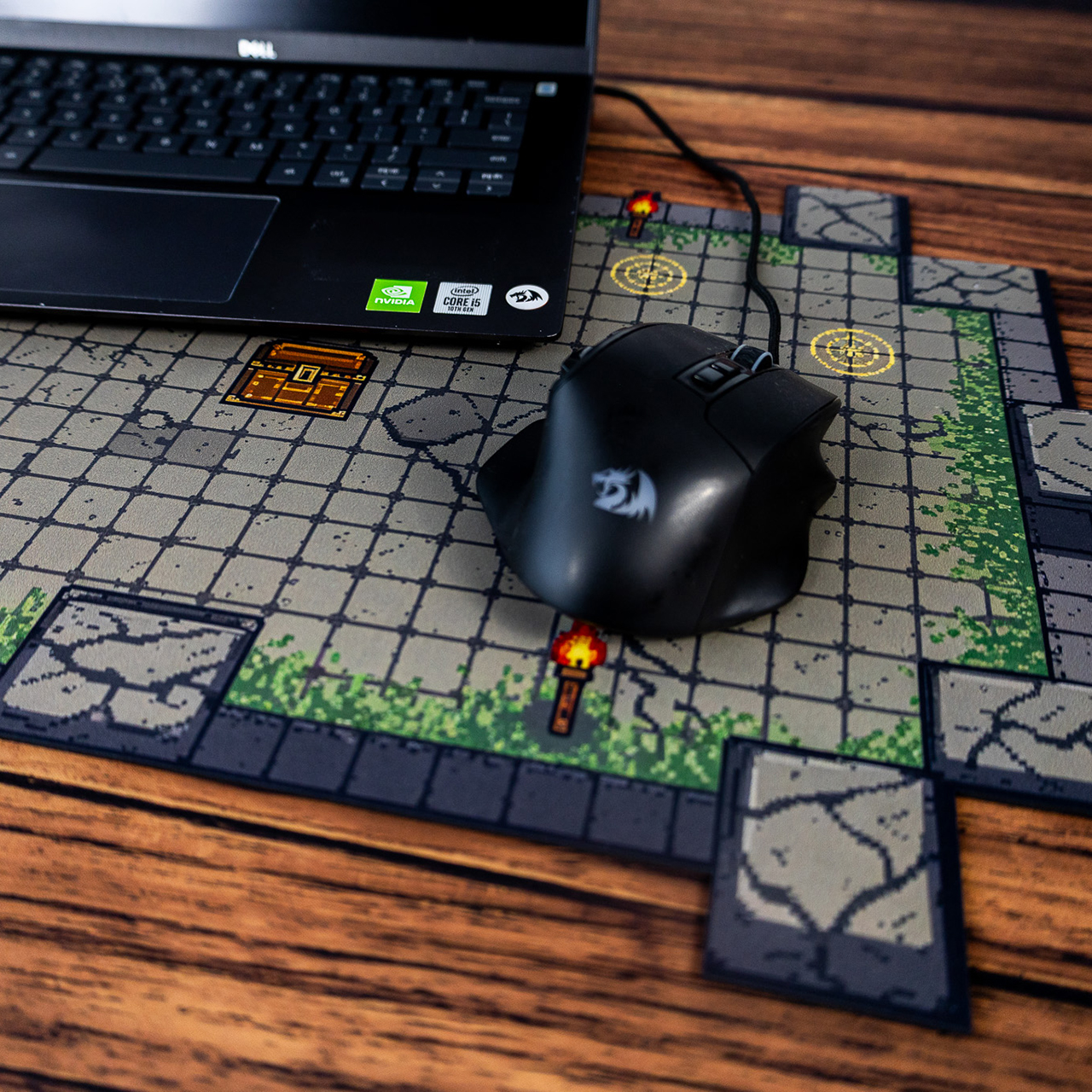 Do you remember the times when simple squares on the screen ignited imagination and every trip into the dungeons involved the thrill of discovering another chamber? The pixel dungeon mat was created with fans of classic video games and retro style lovers in mind. This is not an ordinary rectangle but a shape cut along the outline that replicates a single dungeon chamber with visible exits to corridors. The print depicting a stone floor, mossy walls, flickering torches, and a mysterious treasure chest will turn your desk into an adventure arena. It is the perfect solution for those who want to combine modern comfort with the aesthetics of the 80s and 90s.