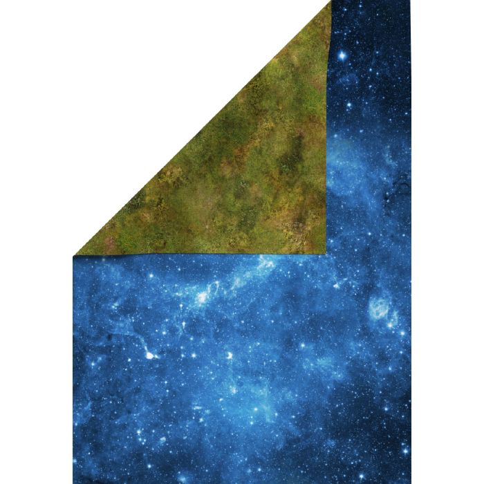 Double-sided rubber mat for RPG and battles with a bright blue nebula print. The 30'x22 ' / 76x56 cm mat is an ideal substrate for RPG and others in a space climate. On the other side of the mat there is a design of a grassy plain, allowing you to introduce even more differentness to the games.