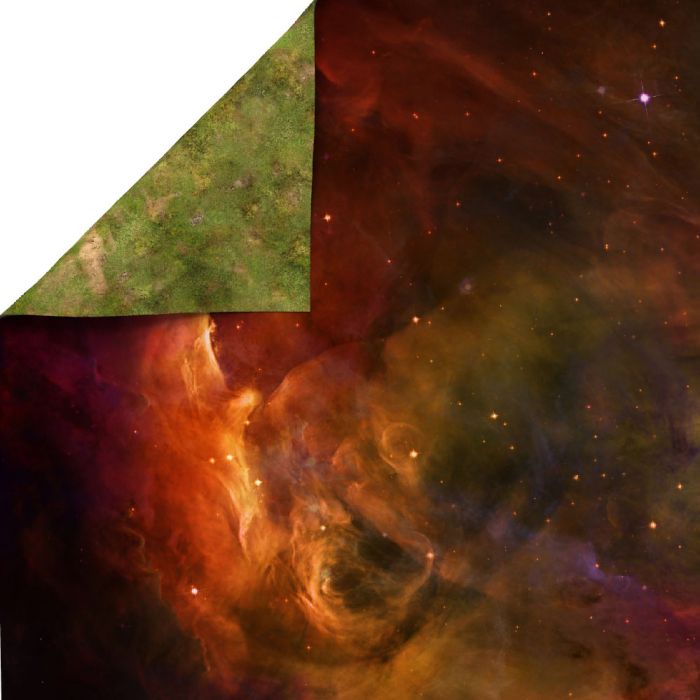The Double-sided red nebula is a mat that perfectly reflects the atmosphere of a mysterious space galaxy in battle games and RPG. A 36'x36 ' / 91.5x91.5 cm rubber mat is great for games in Star Trek: Attack Wing, Battlestar Galactica and Halo: Fleet Wars. On the other side of the mat, a grassy plain pattern is fitting to a variety of skirmishes.