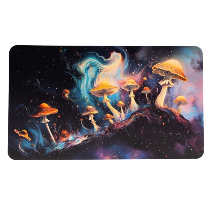 Imagine a forest that does not grow on earth but levitates among nebulae and stars. The Fellowship of the Cap playmat invites you to a world where the boundaries of imagination cease to exist. The graphic depicting glowing, magical mushrooms against a cosmic abyss is a proposal for players who value unique style and a touch of psychedelia. Saturated colors of orange, blue, and purple create a mesmerizing composition that attracts the eye but does not tire it during long sessions. It is the perfect background for decks full of spells, magical creatures, or interdimensional travelers.