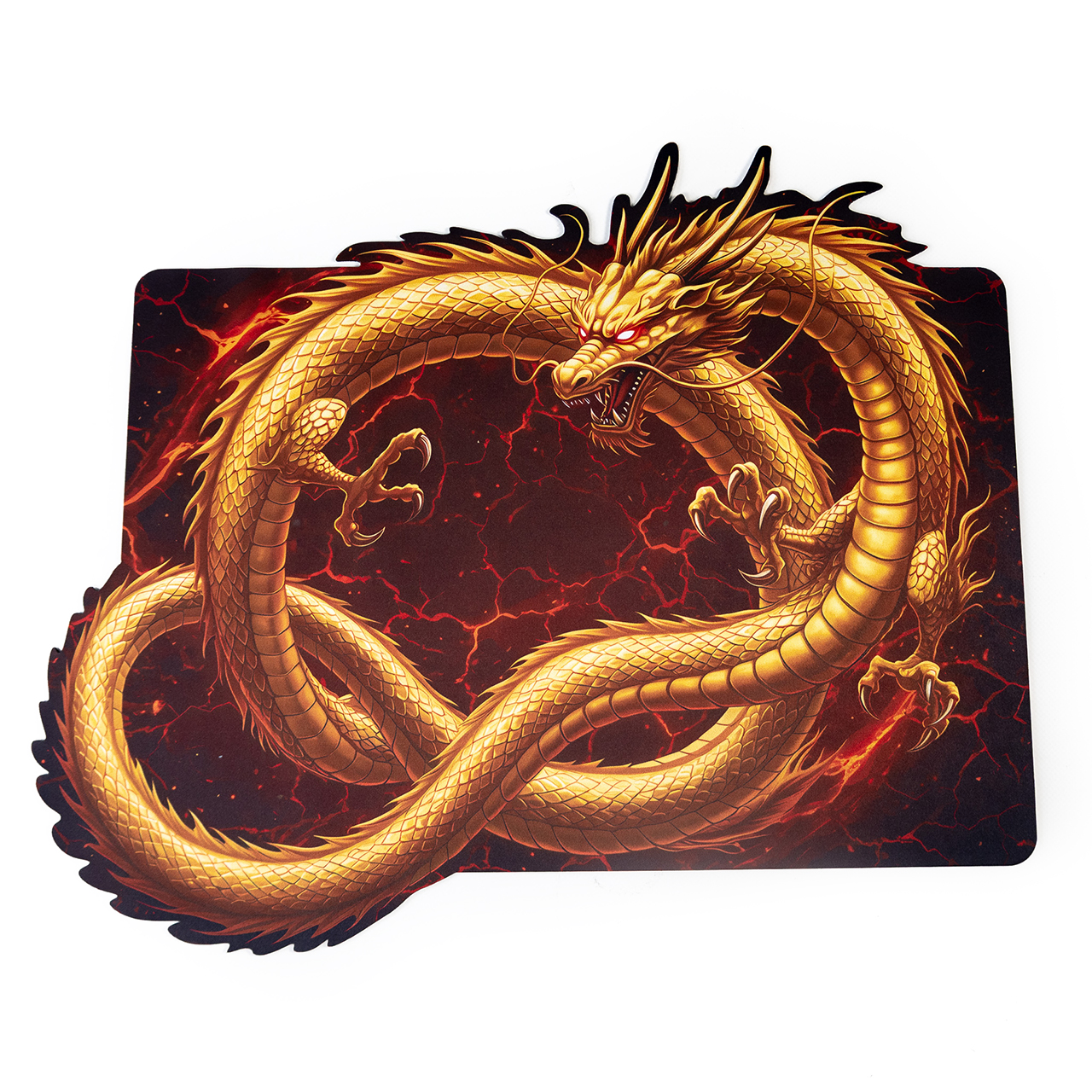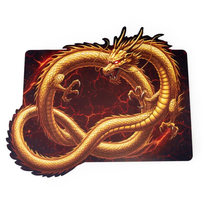 In many cultures, the dragon is a symbol of power, luck, and mastery over the elements. The Golden Dragon mat brings this symbolism directly to your gaming zone. The graphic depicting a majestic Eastern-style golden dragon winding against a background of cracked dark energy makes an incredible impression. However, it is not the print itself that is most important here but the way it has been captured. We used a die-cut technique thanks to which the mat is not a boring rectangle. The beast's head and its tail physically extend beyond the standard outline creating the impression that the dragon is actually moving across your tabletop.