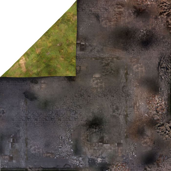 The Double-sided ruined city is a mat that perfectly reflects the atmosphere of war -devastated by the city in battle games and RPG. Waterproof latex mat of 36'x36 ' / 91.5x91.5 cm is great for games in Gaslands, Marvel Crisis Protocol and Fallout Wasteland Warfare. On the other side of the mat, a grassy plain pattern is fitting to a variety of skirmishes.