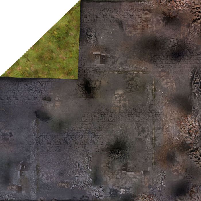 The ruined city is a pattern that will ideally suited to any battle game or RPG played in the ruins of a destroyed city. Double-sided, Waterproof latex mat in size 48 ″ x48 ″/122x122 cm is the best choice for games such as Infinity, Adeptus Titanicus and Dropzone Commander. On the other side of the mat, a grassy plain pattern is fitting to a variety of skirmishes.